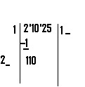 Set up a division with the number 21025 and by grouping each 2 digits of the dividend 21025 from right to left, we can rewrite as 2'10'25. Starting from 1st group from left most, which is 2, guess which square is maximum and less than or equal to 2. Because 1² is less than 2, we can choose 1 as the quotient, and divisor. Place 1 on the right side and left side. Place 1²=1 below 2. Subtract 1 from 2, the remainder is 1.